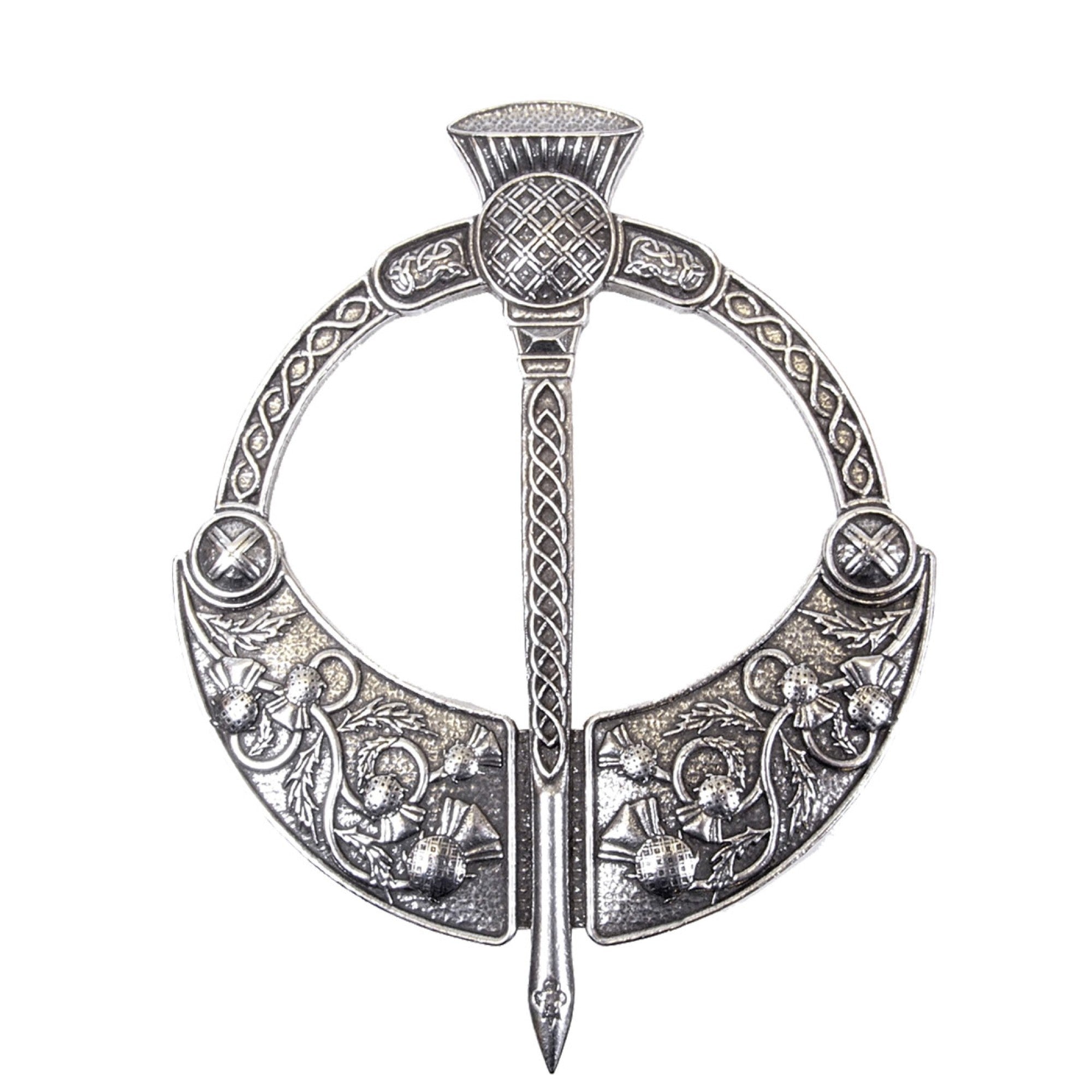 A fixed-pin penannular-style plaid brooch with thistle motif. Brooches with large movable central pins were near universal as garment fasteners in the Iron Age, although the design was heartily adopted and elaborated by the peoples of Scotland and Ireland in the centuries between 700 and 900AD.