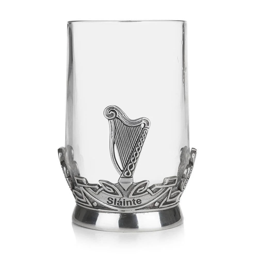 Lift a pint in grand style with our exquisite glass and pewter tankard, a symbol of heritage blending seamlessly with craftsmanship. This masterpiece pays tribute to the heart of Ireland with its beautifully rendered harp and iconic Shamrocks.