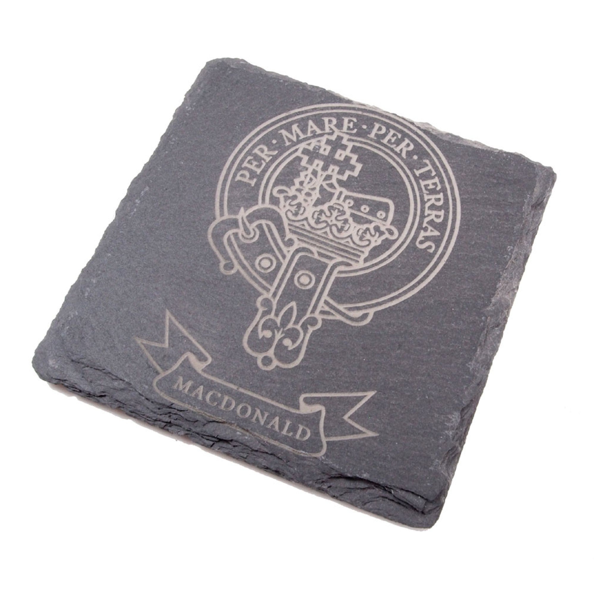 A set of four rustic-slate coasters with the clan crest of your choice, engraved in exquisite detail. Each coaster has four padded feet to avoid scratches to your surfaces. Due to the natural finish each and every coaster is totally unique and one-of-a-kind. These are heat resistant too, so will endure the hottest brew. They're also cold resistant, so are fine to put in the fridge or freezer if the need ever arises. Don't put them in the dishwasher though - clean with a wet cloth, and these can be freshened up from time to time by rubbing in cooking oil with a dry cloth.