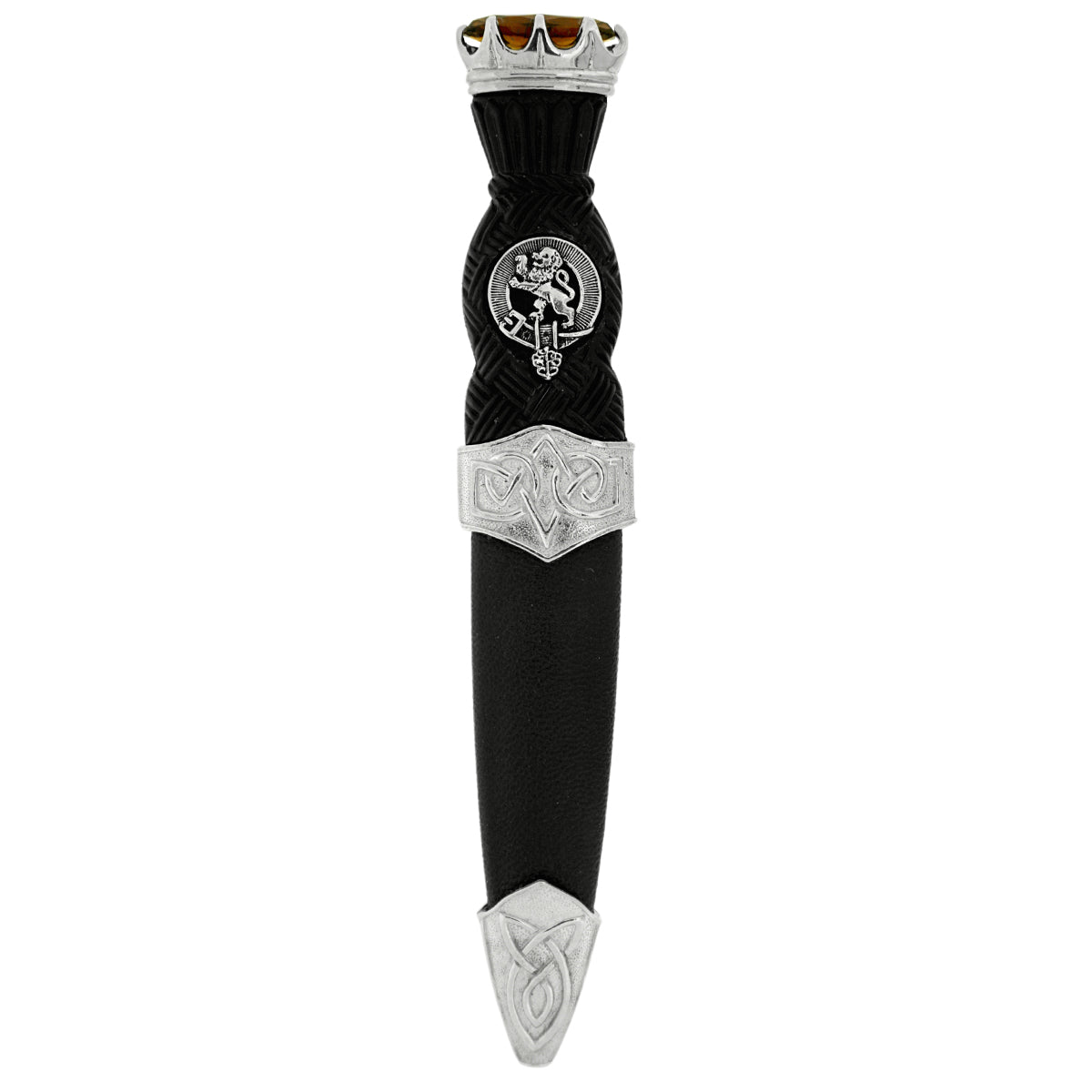 Our Celtic Pattern Sgian Dubh with full cast Pewter Mounts, supplied with a Plain, Patterned or Gem stone Top, and affixed with any of our Clan Crest Badges.