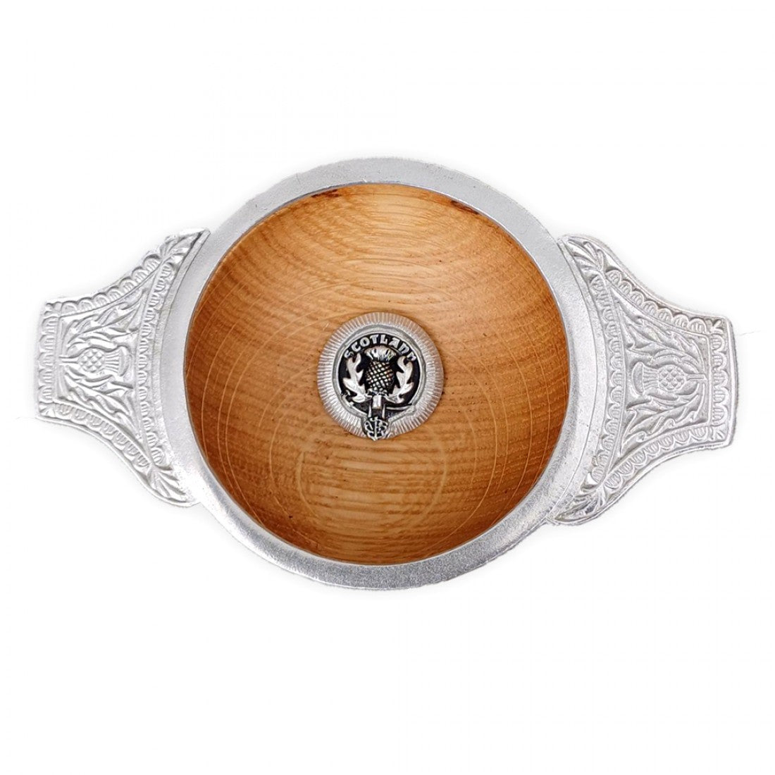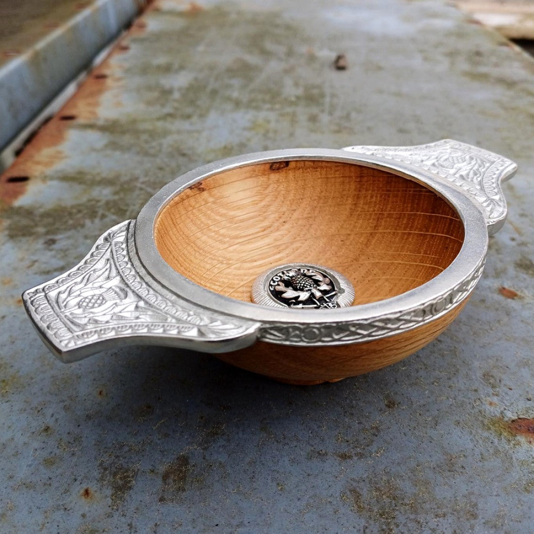 A carved Oak bowl fitted with cast Pewter band and handles. Adorned with your choice of clan crest badge, and finished on the bottom with cork.