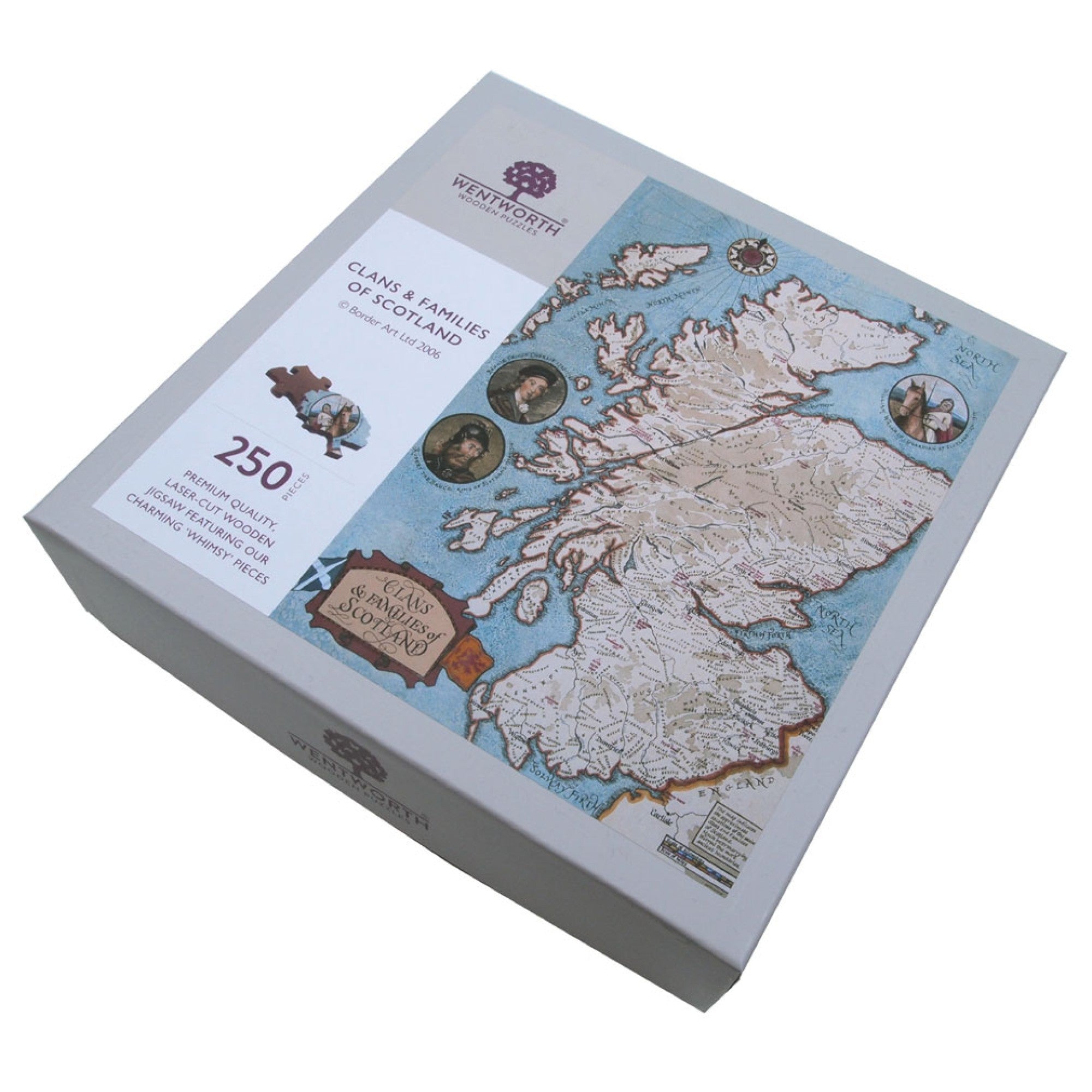 Our ever popular map of the Clans & Families of Scotland by Gill Humphreys, but as a premium wooden jigsaw puzzle. The map shows the approximate location of two hundred and seventy of the most common Scottish surnames. It gives a general idea of where the main clans were located but near the main towns and cities the names have been necessarily compressed.