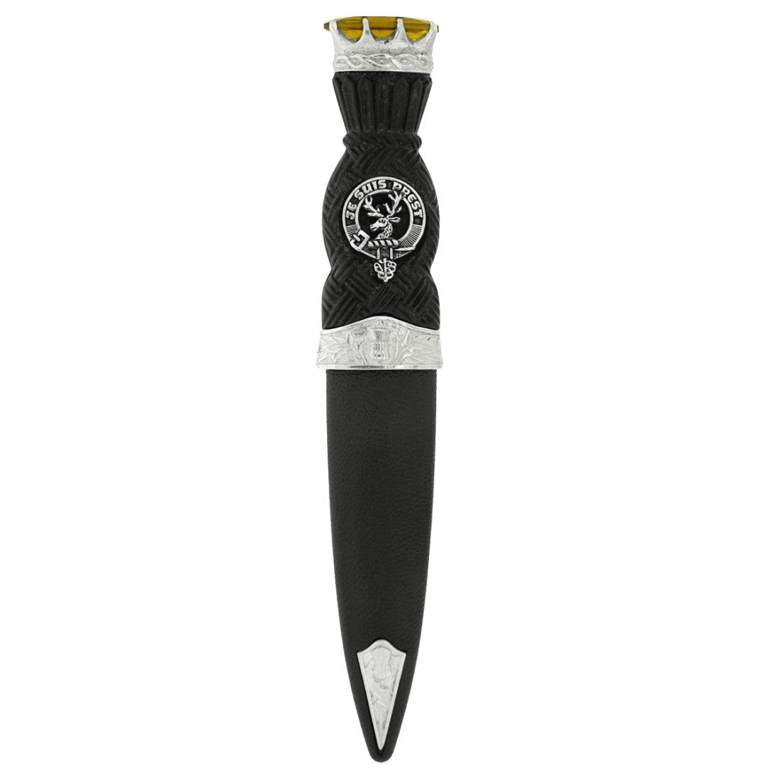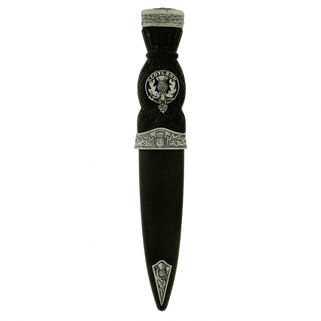 Our Thistle Pattern Sgian Dubh with full cast Pewter Mounts in an Antique or Polished Finish, supplied with a Plain, Pattern or Stone Top, and affixed with any of our Clan Crest Badges.